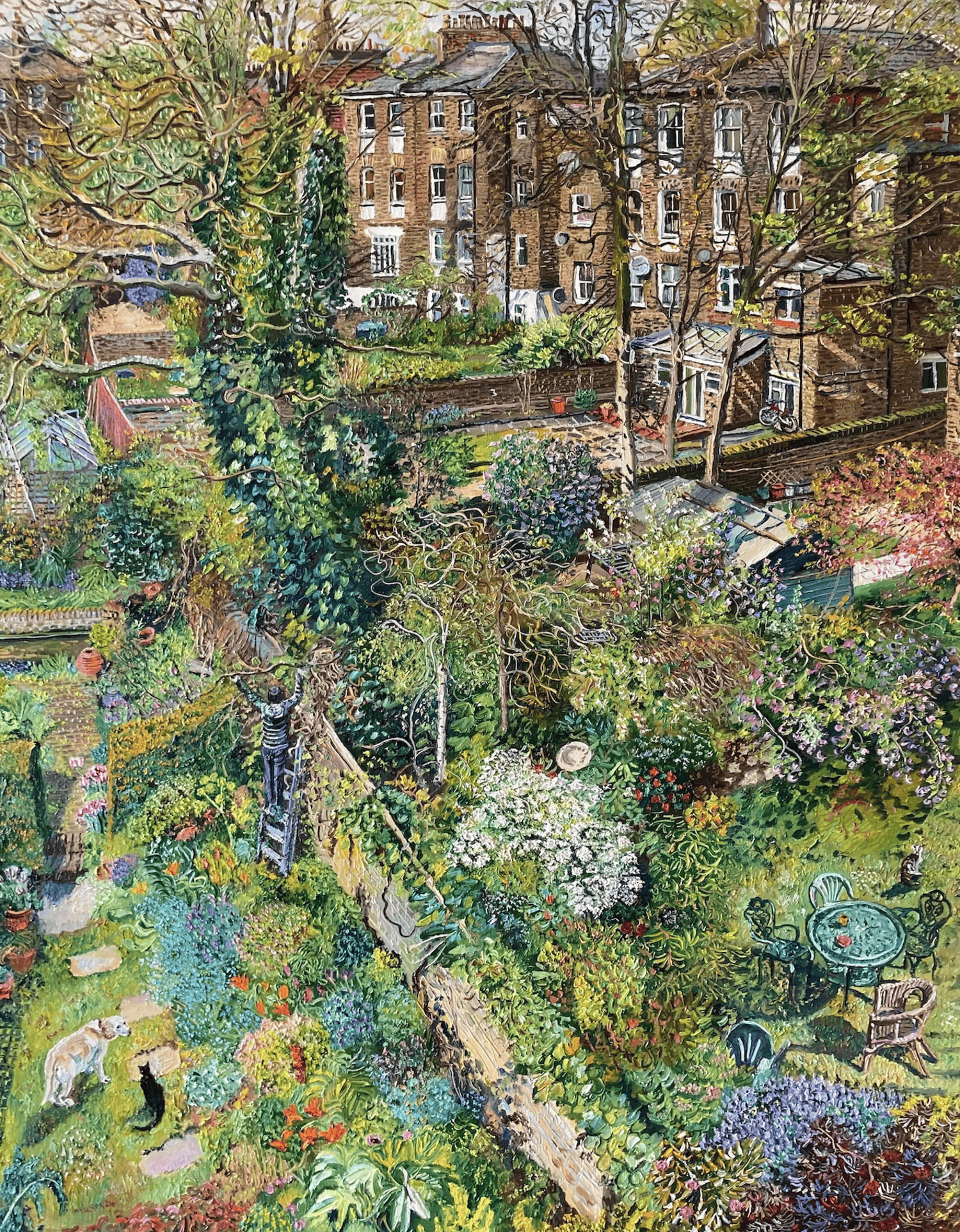 “Finished another spring view from my window, I started it the day after I finished the last one because it seemed that suddenly everything was bursting out in wonderful fresh greens and yellows and lots of purple blooms, in this one I have put my neighbour cutting down the ivy that has got a bit too overgrown, my neighbours are incredible gardeners , I’m very grateful for the lovely view they provide.” (quote for bottom right image/ main page image)